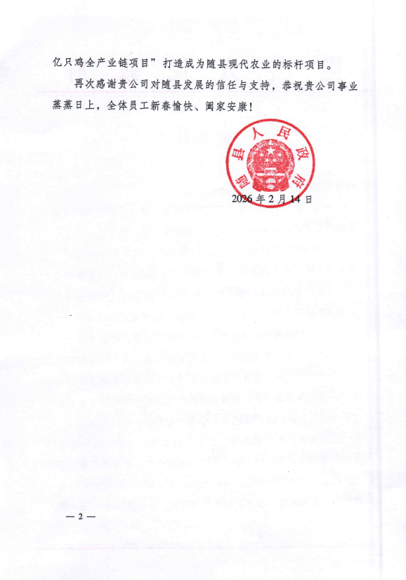 正如随县人民政府在感谢信中所指出的,新的一年是“两亿只鸡全产业链项目”向纵深推进、向高端延伸的关键之年。在各级党委政府“服务至上”理念的有力保障下,项目将在屠宰加工、饲料生产、食品深加工等后续环节持续获得精准支持与服务护航。